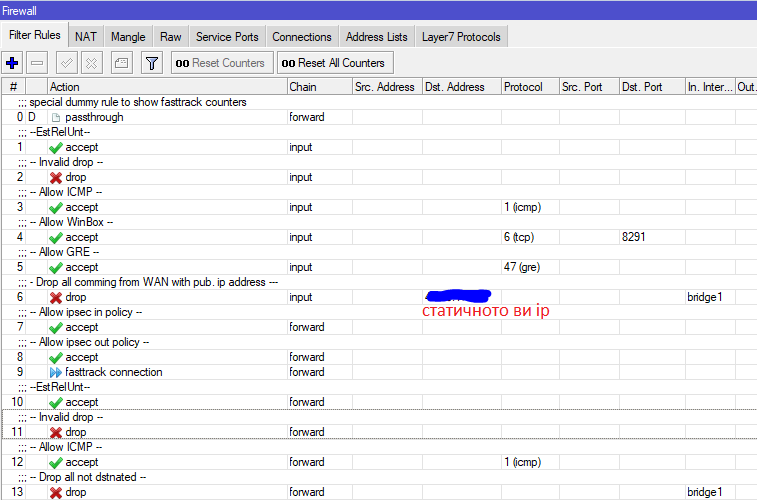 Целта на занятието е промяна на mss размера за да преминава безпроблемно / ip firewall mangle add chain=forward action=jump jump-target=mss comment="tcp, mss" disabled=no add chain=mss protocol=tcp tcp-flags=syn tcp-mss=!536-1460 action=change-mss new-mss=1440 comment="tcp, mss fixation" disabled=no add chain=mss protocol=tcp tcp-flags=syn tcp-mss=1453-65535 action=change-mss new-mss=1440 comment="tcp, mss 1440 for mtu 1492" disabled=no add chain=mss protocol=tcp tcp-flags=syn action=change-mss new-mss=clamp-to-pmtu comment="tcp,mss clamp-to-pmtu" disabled=no помага при тунелни протоколи p.s. Трябва да е в началото на MANGLE правилата3 точки