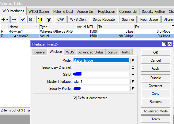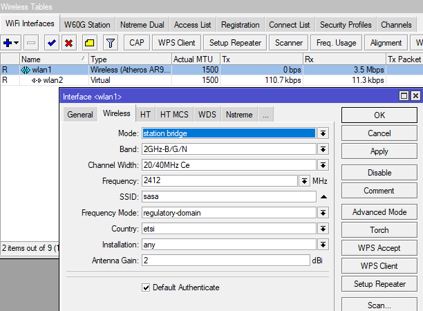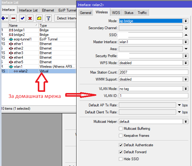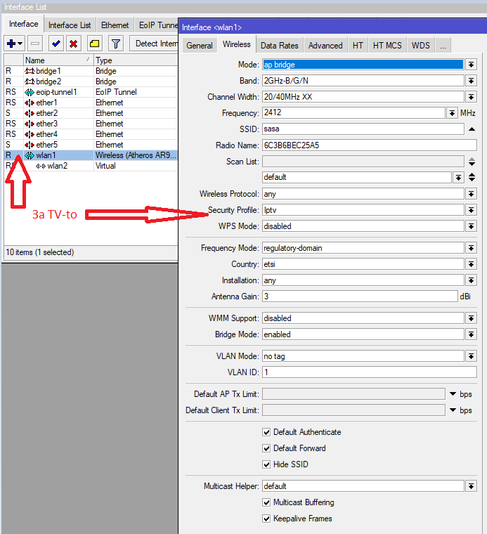 В настройките на радиото трябва да сетните с тикче, default-forwarding=yes , че в момента е на NO, което ще рече , че комуникацията между безжичните клиенти е забранена!3 точки