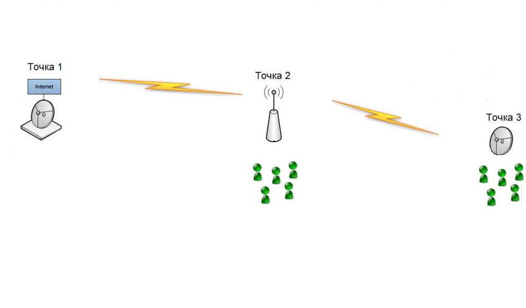 На снимката съм показал Какво мисля да направя Точка 1 ми е главната Антена Точка 2 е на 1 км разстояние от Точка 1 има пряка видимост между двете но няма видимост Между Точка 1 и Точка 3 за това трябва да пусна от Точка 2 към Точка 3 между тях има пряка видимост 1 км разстояние  Питането ми е каква техника да ползвам  за да Прекарам От Точка 1 до Точка 2 поне 60 мб трафик и от Точка 2 до Точка 3 поне 40 мб трафик
