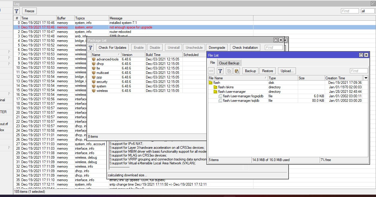 0 computer Отговорено 20 Декември, 2021 Доклад Сподели Отговорено 20 Декември, 2021 Не е сефте. Случвало се е и с други у-ва далеч преди версия 7. Като фикс от Микротик пускат по-малки пакети от стандартните за да може мине ъпдейта. В случая с версия 7 не всички у-ва се поддържат. Ако твоя модел се поддържа пробвай да изтриеш някои от допълнителние пакети като lte, multicast Адрес на коментара Сподели в други сайтове More sharing options...