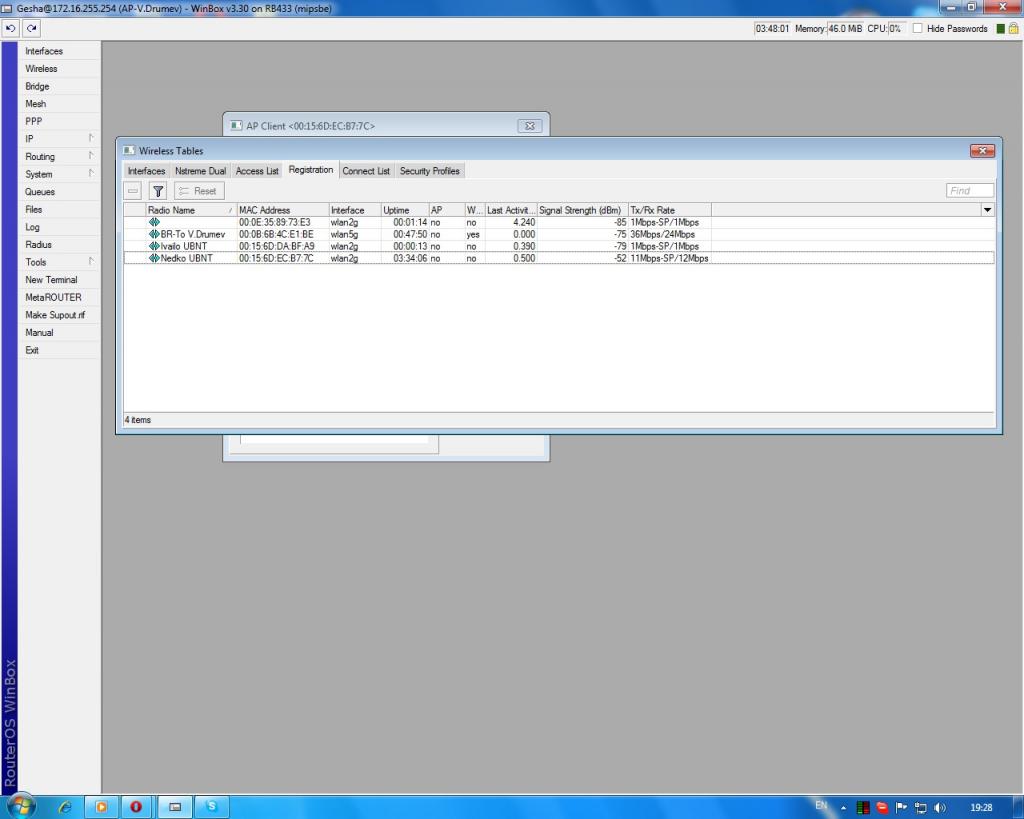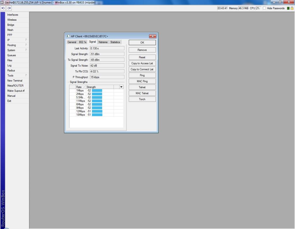Става на въпрос за RB433 който има карта на 2,4 гхз в AP Bridge mode и панелна антена която разпръсква нета. На нея са закачение 3 - 4 човека. Някои са с мн добър сигнал -55 -60 обаче всички се закачат на много ниски скорости и ccq при всички е ужасно.