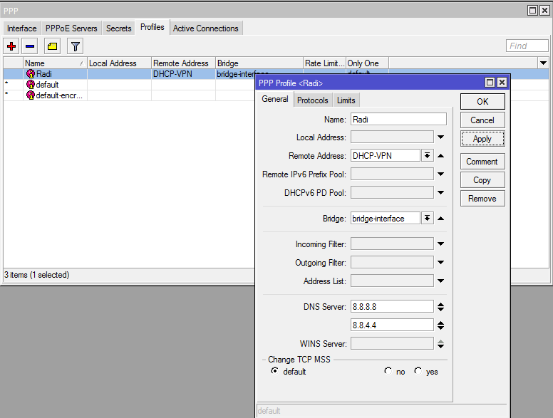 Така... в профил, не настройвай нищо. В Secret настрой юзер нейм, паролаq Service=pptp, Caler ID ти е IP-то от което ще правиш връзка, ако не си параноик на тема сигурност, не го сетвай... Profile си избери някой от дифолтните, съответно ако искаш или не искаш енкрипшън. Local, Remote address и Routes си сетни някакви IP-та от една, за предпочитане свободна мрежа. После в /ip/address сложи едно IP на някой от вътрешните интерфейси на рутера, като трябва да е същото, което си задал за gw в акаунта за PPTP, като го зададеш и с маска.. примерно 192.168.20.1/24 Това ти е достатъчно за PPTP конекцията. Тъй, като през нея ще се пренасочи целият трафик на клиента, си оправи и правилото за нат във файруола, за да има и той нет.... това естествено, ако не си го задал, като маскарад върху интерфейс, без повече уточнения.