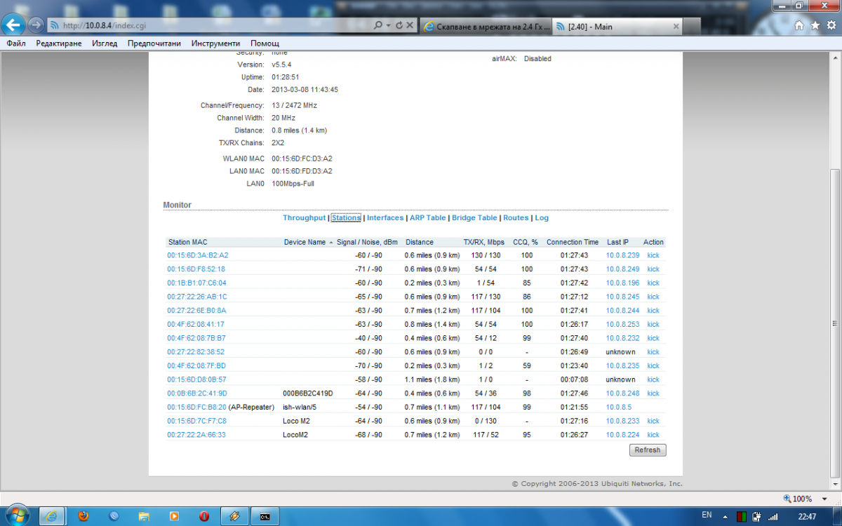 Главното устройство е Рокет М2, а клиенските са локо и локо М2. Невъзможно е да се закачат чужди, защото има ограничение по МАС, проблема явно е в някое от своите, но как да го открия? Изключвал съм ги едно по едно, спирал съм само торентаджиите и тъкмо, като си помисля, че съм хванал виновника, пинга пак скача.