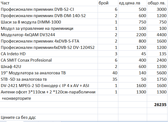 miccito Отговорено 24 Октомври, 2013 Автор Доклад Сподели Отговорено 24 Октомври, 2013 (Редактирано) Описанието на станцията и цени може да видите на снимката станция инфо. Можете да ги видите на сайта http://digiviewtv.com. Станцията работи 1 година безпроблемно.QAM-вета са на 256. За контакти Георги Мицков тел 0878613981 Станция инфо и цени. Цифровата част продадена.Остава аналоговата част-40 модулатора + 2 рака комплект 6300лв. Описанието на станцията и цени може да видите на снимката станция инфо. Можете да ги видите на сайта http://digiviewtv.com. Станцията работи 1 година безпроблемно.QAM-вета са на 256. За контакти Георги Мицков тел 0878613981 Станция инфо и цени. Цифровата част продадена.Остава аналоговата част-40 модулатора + 2 рака комплект 6300лв. Редактирано 29 Май, 2013 от miccito Адрес на коментара Сподели в други сайтове More sharing options...