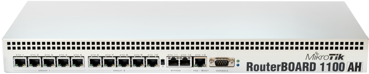 Той има тринадесет отделни Gigabit Ethernet порта, два 5-портов суич групи и включва Ethernet възможност за байпас. RB1100AH също има SODIMM слот с пакетни 2GB оперативна памет, един слот за карта microSD, пейджър и сериен порт.