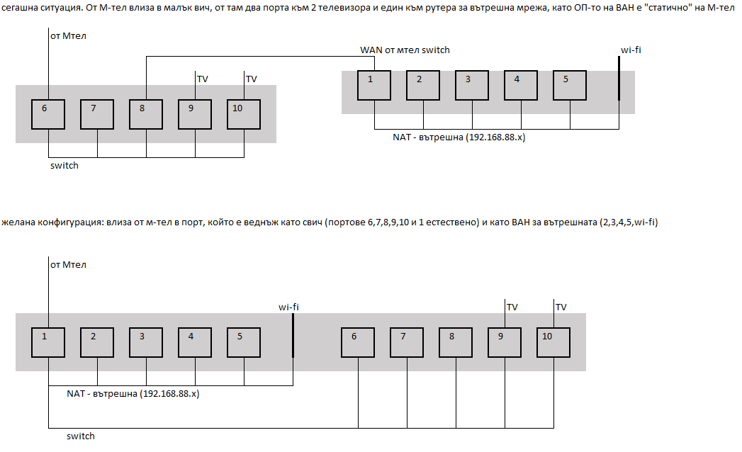 Вземам тлевизия и интернет от Мтел. За целта те ми дадоха някакъв суич и след него имам приемници и моя рутер. за по-голяма яснота може да видите приложената снимка: