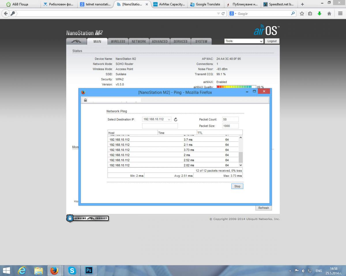 Това wds го пуснах един път и пинга стана над 1000 дали аз нещо не обърках. За момента мрежата се вижда защото има настройки все още иначу после ще я скрия. Ако знам и сигнала как да го вдигна. За късмет точно на пътя на сигнала има едно добро дърво няма как да преместя антената.