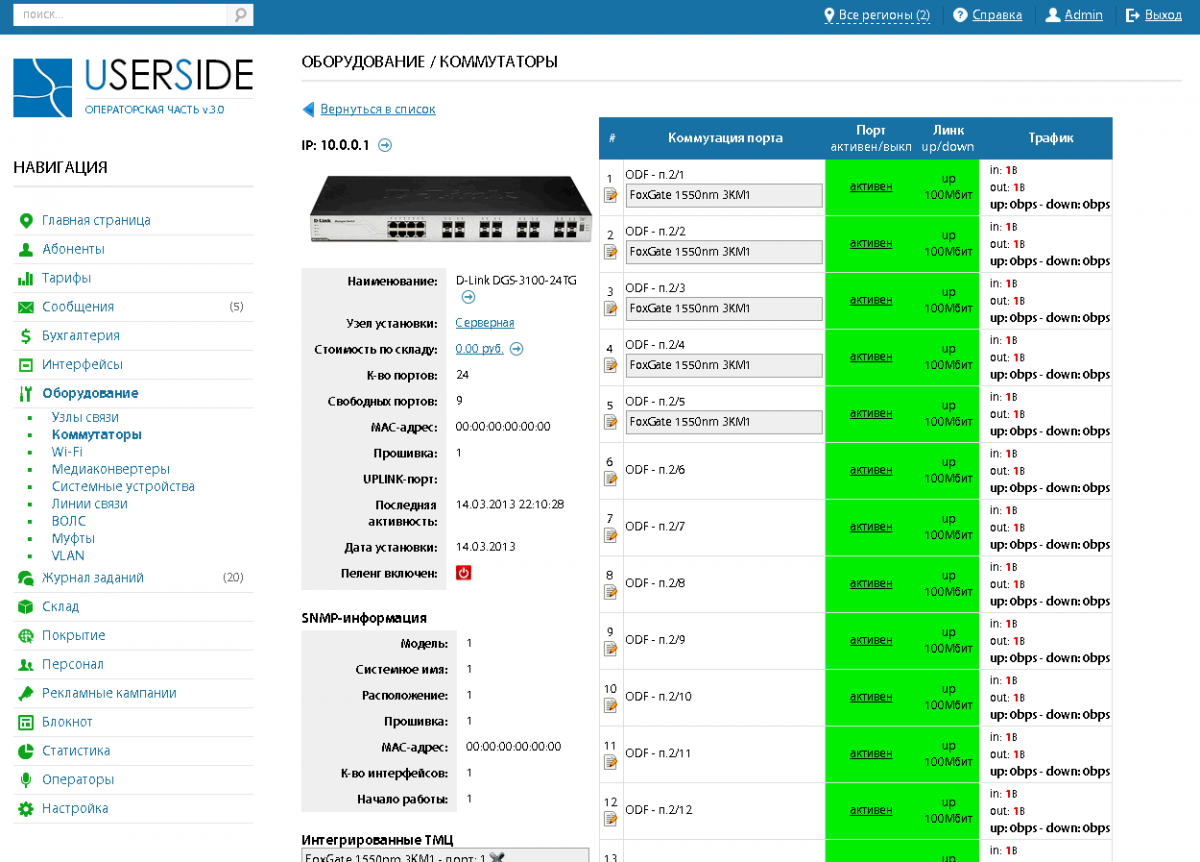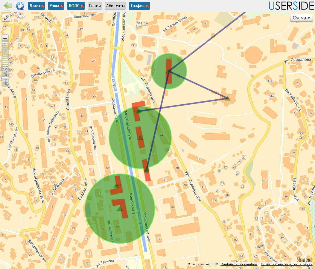 Основната функция на софта е да работи съвместно със билинг ситема която ползвате, а не да я замести. Обичайно, билингите имат модул за клиените със адреси, контакти и т.н., модул за услугите, и модул за плащания - кой платил, кога платил, пуснат, спрян. Тази информация се импортира регулярно към UserSide и на нейна база се вадят статистики по много различни параметри. Освен това, останалия фунционал изобщо не съществува в билинг системите - кабелно стопанство, безжични устройства, комутатори, рутери, склад, работници, групи, заплати, повечето популярни билинги нямат и тикет система за аварии, тук я има и т.н. Инвертаризацията на мрежата е уникална - с разполагане на кабелите и всички елементи от мрежата върху карта (ваша подложка или онлайн карта), изчисляване дължините на кабелите, опис на връзките в оптичните муфи или в кутиите, покритие на секторите на безжични устройста и много други.