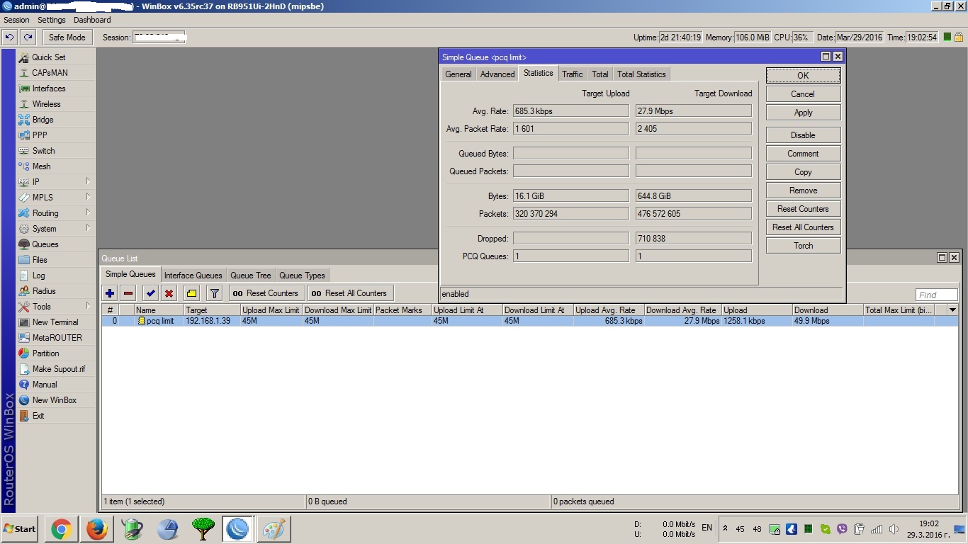 0 ka4o_pi4a Отговорено 29 Март, 2016 Доклад Сподели Отговорено 29 Март, 2016 Опитай в simple queue да зададеш max limit и на advanced limit at. Разцъкай там и трябва да започне да работи. Ето при един клиент как съм отрязал определен адрес да не вдига повече от 45 мегабита. Адрес на коментара Сподели в други сайтове More sharing options...