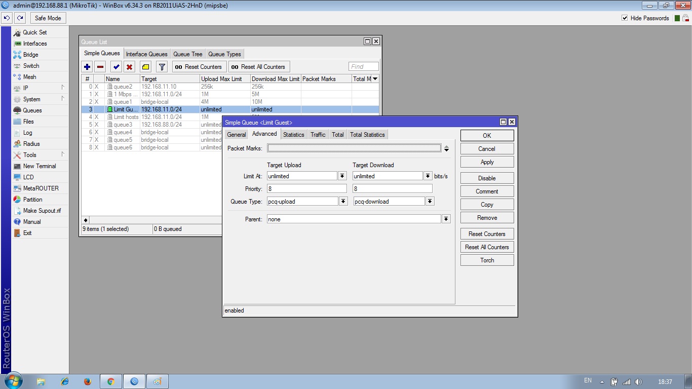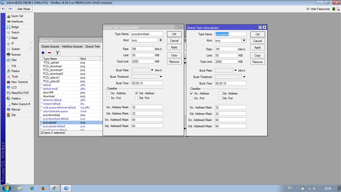 0 Администратор JohnTRIVOLTA Отговорено 29 Март, 2016 Администратор Доклад Сподели Отговорено 29 Март, 2016 (Редактирано) Еми гледам си задал вече PCQ Type , Така че остава да си зададеш в Simple Queue General-target = 192.168.11.0/24 и Advanced-queue type= нагласеният от теб PCQ Type за upload и download ! http://s13.postimg.org/r0p1pkfzr/SQgeneral.jpg http://s27.postimg.org/ha35snh8j/SQadv.jpg P.S. Нали говорим всеки клиент да е със споменатата скорост , а не цялата мрежа ?! Редактирано 29 Март, 2016 от JohnTRIVOLTA Адрес на коментара Сподели в други сайтове More sharing options...