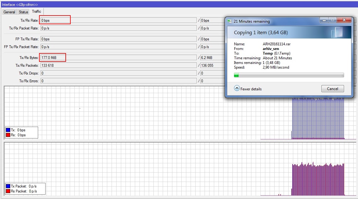 Имам изграден VPN по L2TP/IPsec. Станното е, че всеки път при достигане на точно 177,00MB трансфер /например при сваляне на голям файл/ копирането спира и тунела се drop-ва. Използвам вградения L2TP/IPsec на Windows. ОС е Windows 7 64bit. Това става и при свързване към рутера по Wi-Fi, по кабел и директно към ISP без рутер.