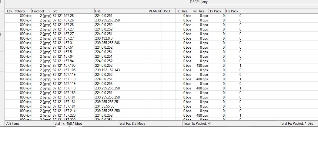 Добър ден момчета. Имам един проблем, който няколко дни вече не мога да реша и затова се обръщам към вас, по-разбиращите за помощ. Преди седмица поставих един микротик в офис, в който имаха оплаквания от проблеми с нета и чести прекъсвания. Първата ми стъпка бе да заменя съществуващия netgear с hap-lite и проблемните им места се видяха. Мисля че ги отстаних, но остана един неприятен флууд по igmp (multicast), които вече нямам идея как да погася. Изглежда ми като Dos от спуфнати адреси, защото в Interface/torch виждам заявки от няколко почти цели мрежи. Написах доста правила, но сякаш колкото повече рестрикции слагам, толкова по-брутален става. В началото бе 3-4Mbps, а сега на моменти достига 13-15Mbps. Недостатъчен е за да запълни канала и свързаност има, нета не пада, но ме е яд, че вече нямам идея как да противостоя на това. В мрежата има ДВР с камери по коаксиал плюс две по ip. Разгледал съм им настройките и мисля че при тях няма проблем, но като гледам резултатите съмненията ми падат върху тях и един мрежови WIFI принтер, които за момента съм изключил . Някакви идеи какво е това чудо и може ли да се погаси по някакъв начин?